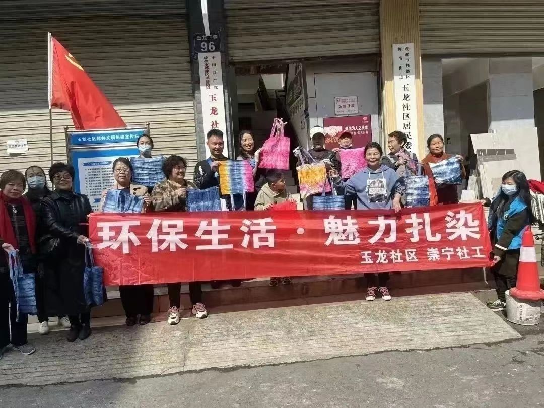 扎染古称扎缬、绞缬,是中国传统的手工染色技术之一。本次活动,由玉龙社区主办,成都市郫都区崇宁社会工作服务中心承办,球盟会协办,旨在宣传“绿色、低碳、环保”的理念,传承非遗文化扎染民间艺术,建立和睦邻里关系。