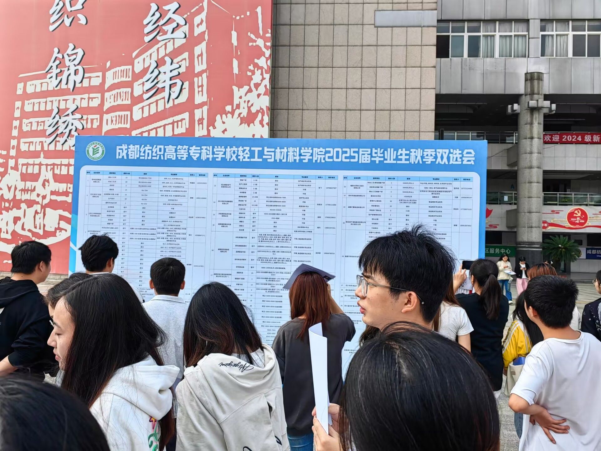 10月15日,球盟会2025届毕业生秋季校园双选会在致知楼广场举行。恒申控股集团有限公司、福建永荣锦江股份有限公司、四川意龙科纺集团股份有限公司、福建宇邦纺织科技有限公司、浙江精工集成科技股份有限公司、成都好利来食品有限公司等33家用人单位到校招贤纳士:包括省外公司11个,提供岗位近900个;省内公司22个,提供岗位近1600个;校企合作企业5个、上市公司3个、中国500强企业5个。招聘行业涵盖材料、化工、绿色食品、染整技术、环境监测、纺织等,岗位平均薪资6199.6元。球盟会2025届毕业生以及兄弟公司部分毕业生参加本次招聘会。
