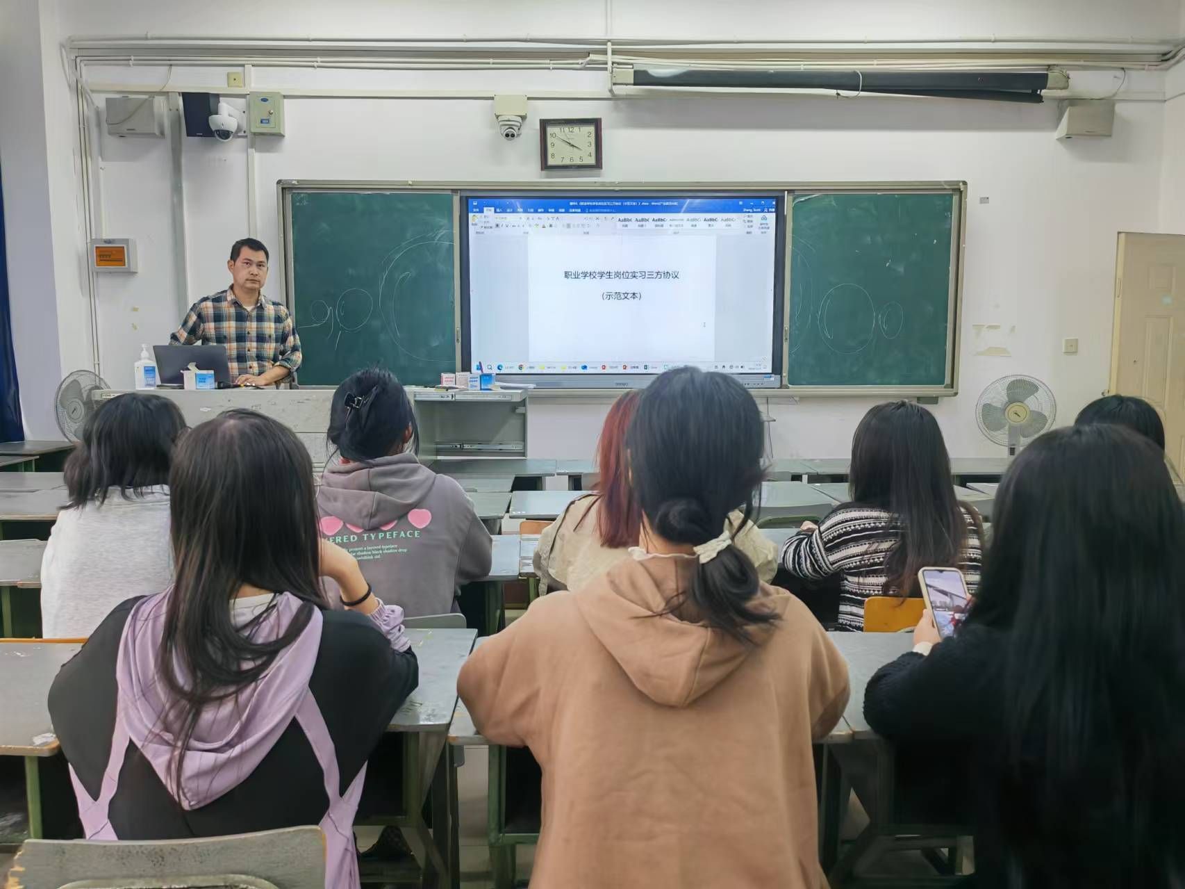 蒋悦重点就岗位实习时间安排、工作要求、教学目标、资料准备等内容进行全面部署。她还要求同学们务必遵守岗位实习规章制度,树立岗位实习职业形象,学会学习、学会做人、学会做事,在岗位实习中充分展现职业素养。