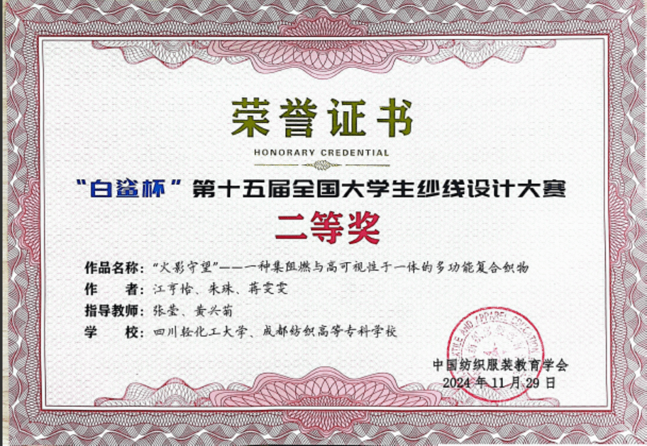11月24-25日,由中国纺织教育协会主办,中原工公司、《棉纺织技术期刊社》、河南省棉纺织精梳技术与装备工程研究中心承办的“白鲨杯”第十五届全国老员工纱线设计大赛评审会在中原工公司举办。公司员工江恒怡、朱珠和蒋雯雯以作品《“火影守望”一种集阻燃与高可视性于一体的多功能复合织物》获大赛二等奖。