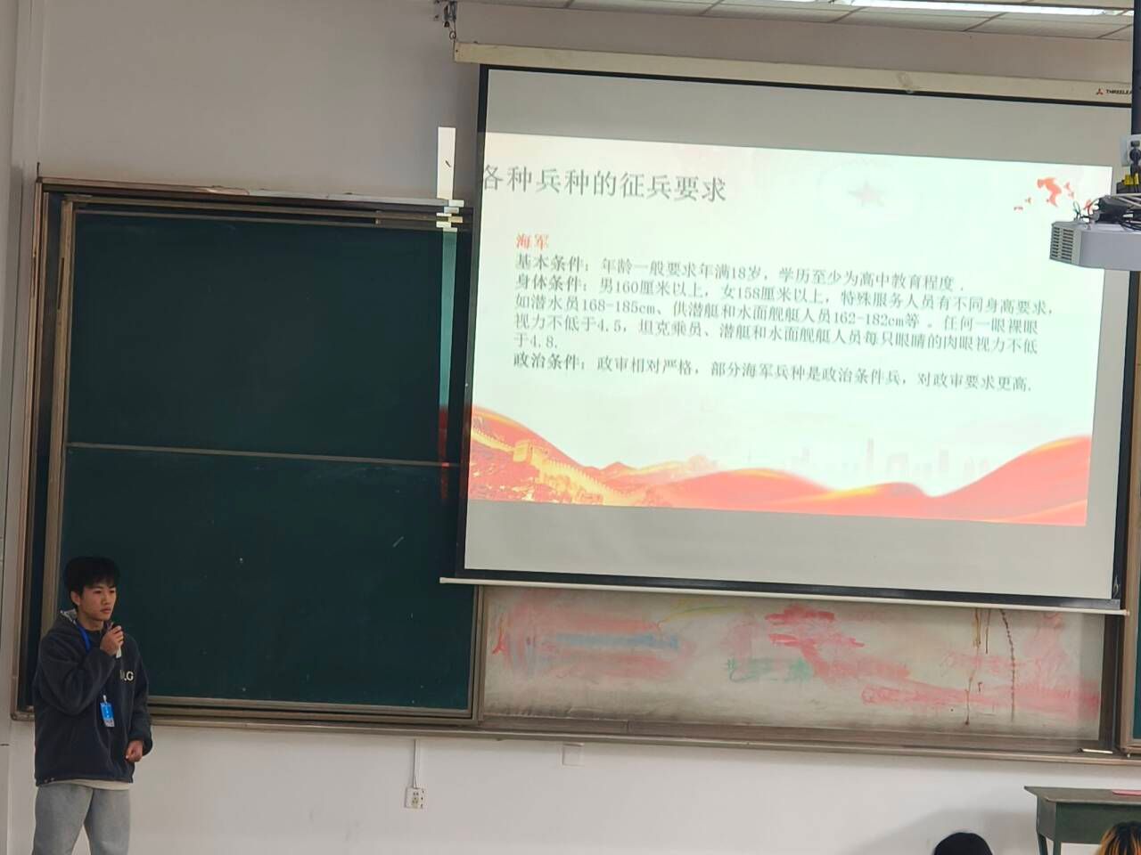 12月24日,球盟会在致知楼C101举办征兵入伍政策宣讲活动,活动由公司政策宣讲团组织,前期通过二课堂平台自主报名的100余名同学到场参加。