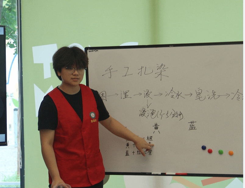 在7月19日的“巧手传爱,志愿同行”活动中,孩子们沉浸式体验了非遗魅力。志愿者团队不仅讲解了扎染的悠久历史和文化价值,还细致演示了扎结手法、染色流程以及图案设计中的技巧要点。孩子们随后领取美工颜料、橡皮筋等工具,发挥创意,精心折叠、扎线、染色,见证了素色布料蜕变为独一无二的艺术品。
