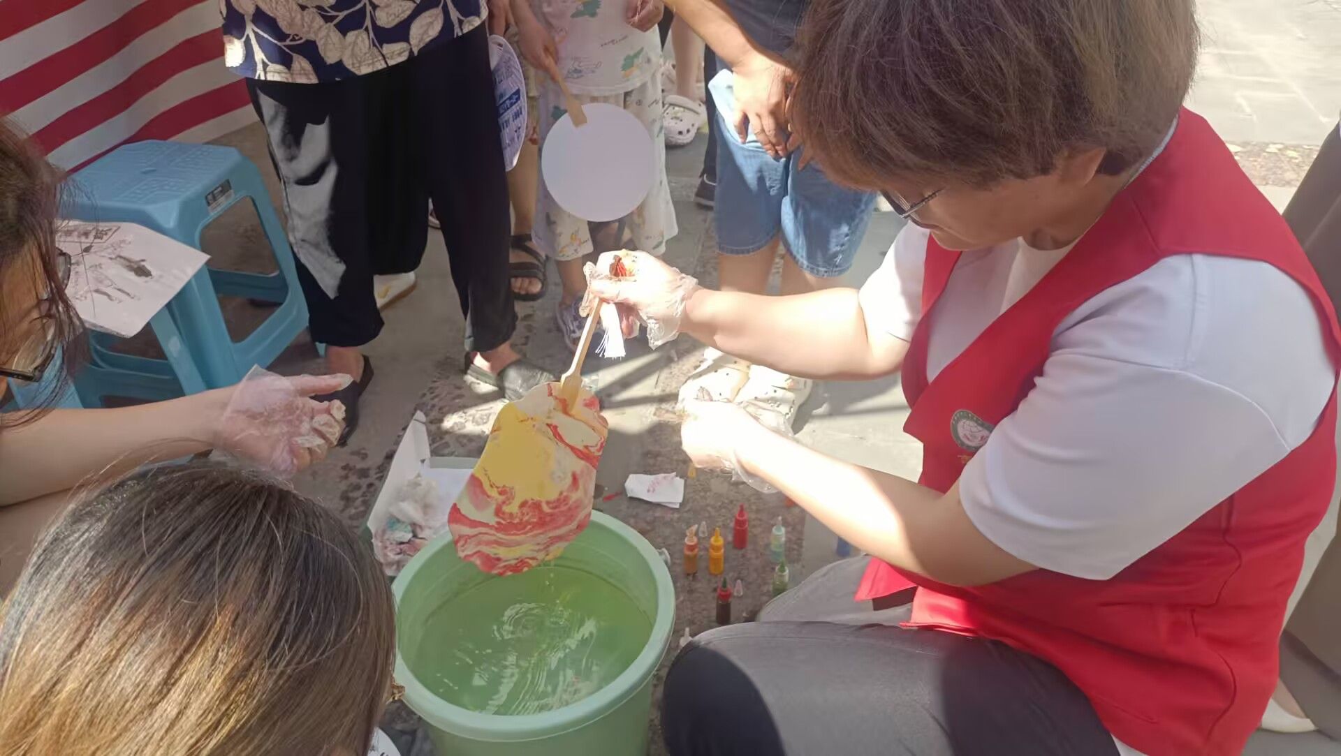 7月21日,“水榭花都”居民住宅小区开展了“翻扇越岭,与你漆行”大漆染扇非遗推广行动,团队以流动吆喝结合摊位展示吸引社区居民参与。活动中,志愿者用通俗语言介绍大漆工艺历史,演示调漆、染涂技法及防护要点。参与的社区居民结合自身喜好及独特创意,请志愿者帮调自己心仪的颜色,再执扇轻浸大漆,当青绿山水在绢面上自然流淌,人群中响起阵阵惊叹。活动尾声的作品展示与交流环节,进一步加深了社区居民对大漆技艺的理解。